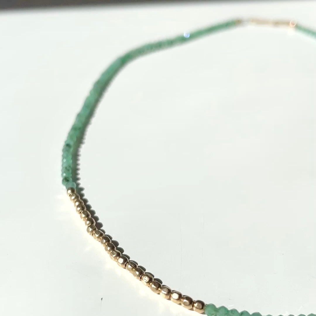 This beauty is made with tiny natural Emerald beads enhanced with an asymmetric section of shining gold. Designed to sit at the base of the neck and skim the clavicle, it looks amazing alone or layered with other necklaces from the Minima collection. It is finished with a handcrafted recycled 9ct gold S-clasp to give it a luxurious edge.