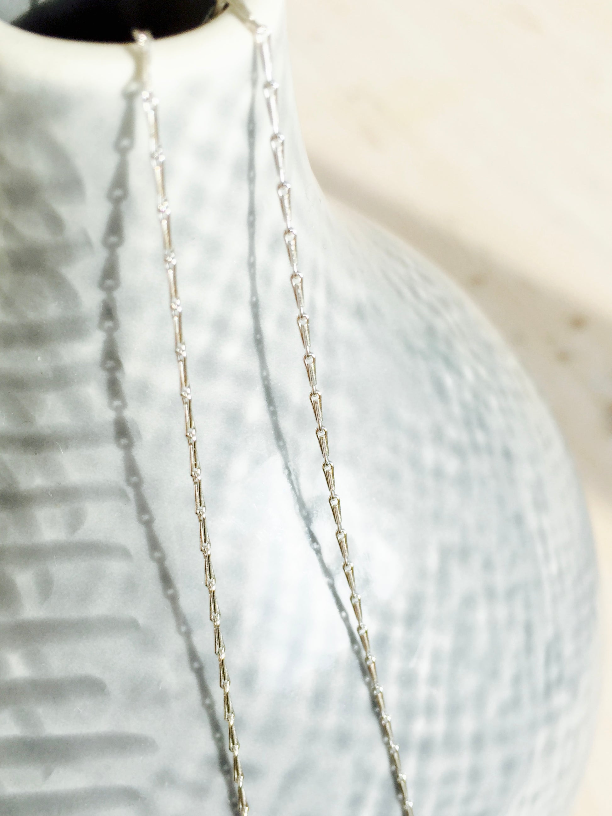 The Barleycorn or Hayseed chain is made of long and thin links that are teardrop in shape and all line up symmetrically. This lightweight but solid chain is lovely worn to hang a pendant or as a beautiful necklace in it's own right.