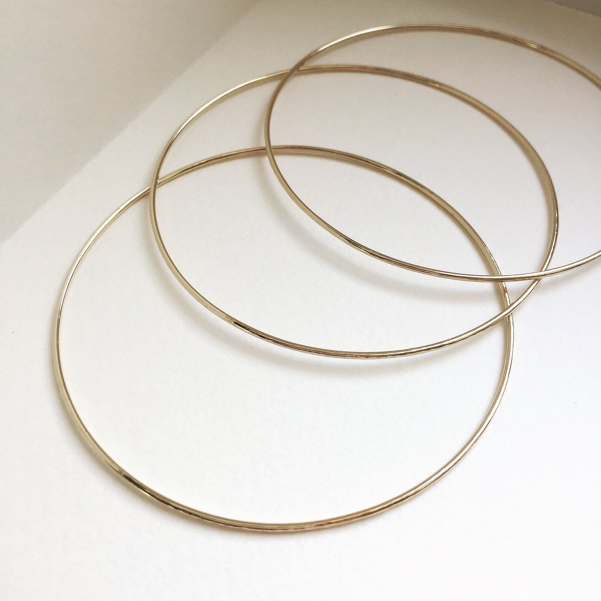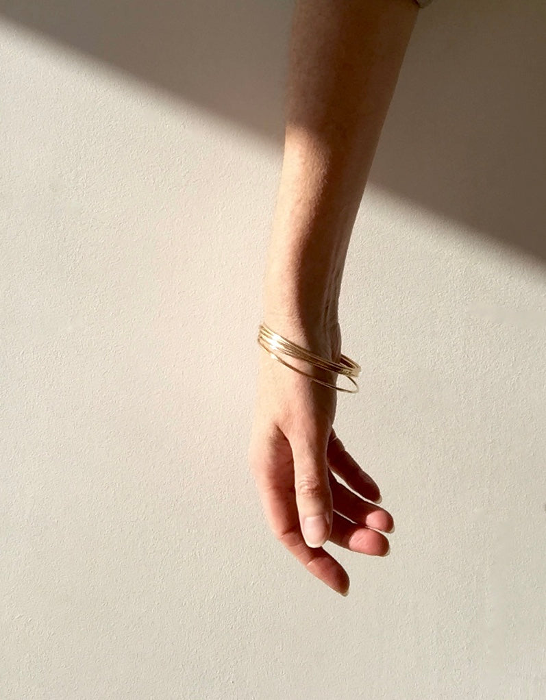 While customers may wear the bangle as they please, we don't recommend wearing this bangle alone due to it's delicate nature. It is prone to bending when worn alone, but when stacked with other bangles it can be worn as an everyday piece. You should expect some slight change in shape when wearing this thin bangle, which is the nature of this delicate piece and part of it's design.